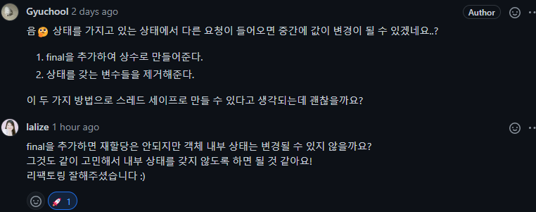 final로 완전한 불변이 안 만들어져서 아예 내부 상태를 갖지 않도록 하는 게 좋은 것 같다!