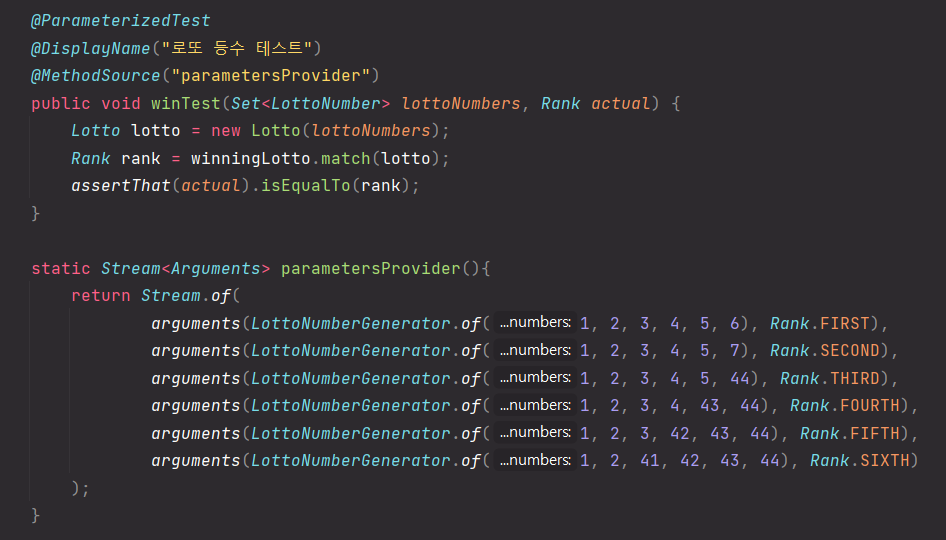 이렇게 긴 코드를 @ParameterizedTest, @MethodSource("methodName") 를 사용하면 아래처럼 줄어든다.