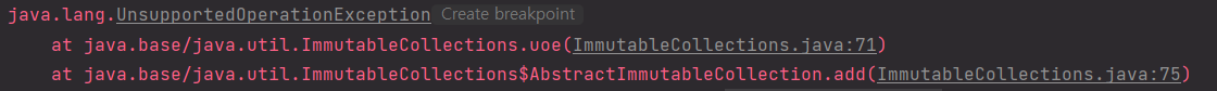 ArrayList<>()에 List값을 하나만 넣으려면 List.of()를 감싸서 넣으면 된다. 그렇지 않고 List.of()로 한 후 add를 하면 아래처럼 UnsupportedOperationException이 뜬다.