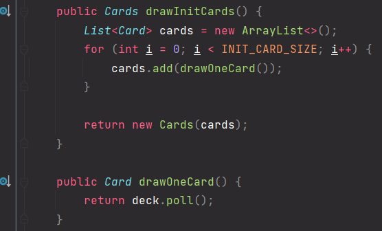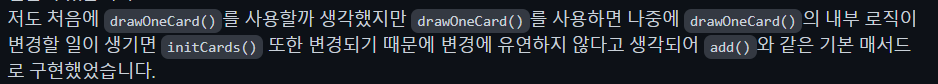 initCards()는 카드 초기화를 위해 두 장의 카드를 뽑는 메서드고, drawOneCard()는 한 장의 카드를 뽑는 메서드니, drawOneCard()의 내부 로직이 변경되면 initCards()또한 변경되는 것이 맞지 않을까요?만약 뽑고 카드를 다시 반납하도록(deck에서 삭제가 되지 않도록) 요구사항이 변경된다면 drawOneCard()만 변경해주면 되는 이점이 있을 것 같아요. 이게 바로 중복을 제거함으로써 유지보수가 편해지는 것이구요. 😃